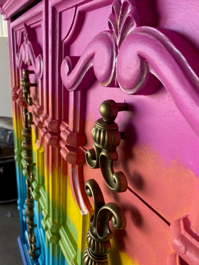 Once everything was dry, I reattached the hardware. I was initially unsure whether the metallic gold spray paint I used would be “shiny” enough, but I’m really happy with how it came out! This dresser is a one-of-a-kind piece that makes my inner child extremely giddy.