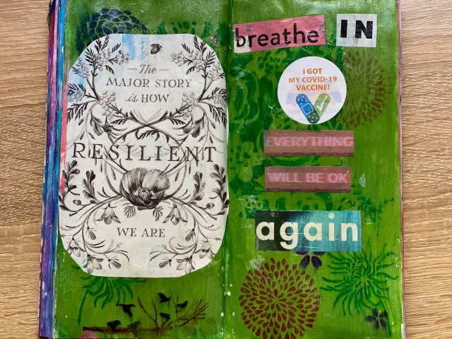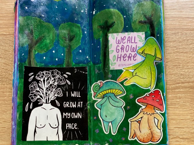 I periodically cut out images or quotes from magazines that inspire me. I store these in a folder, and whenever I want to art journal, I’ll look through them to figure out which ones I might want to use. I’ll do the same with stickers. I’ll spend some time arranging the different elements together before glueing or sticking anything to the page.