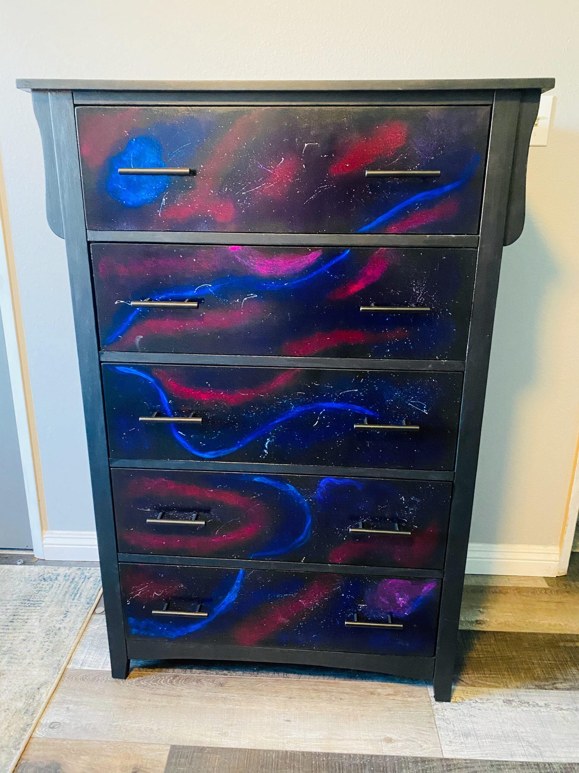 A while back, I wrote about how I made some galaxy nightstands. Now, I’m ready to share my galaxy dresser!